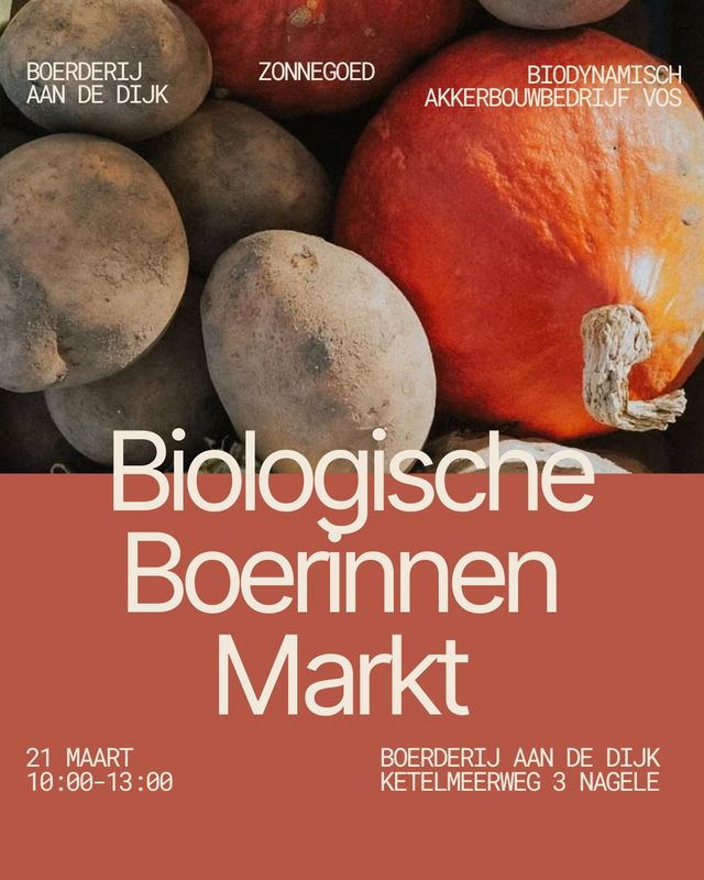 Op zaterdag 21 maart 2026 verkopen drie biologisch(-dynamische) boerinnen hun producten bij Boerderij aan de Dijk bij Nagele. Daarmee sluiten ze aan bij de landelijke actie: “Bio voor iedereen – betaal hetzelfde, krijg meer” Tijdens deze dag worden er op meer dan 45 biologische boerderijen door heel Nederland producten verkocht.