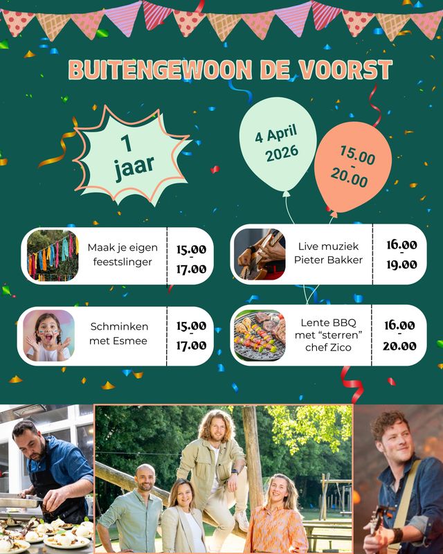 Buitengewoon De Voorst bestaat 1 jaar en dat vieren ze graag samen met jou! Kom zaterdag 4 april tussen 15:00 en 20:00 uur langs in het restaurant en de speeltuin voor een gezellige en feestelijke middag vol leuke activiteiten: